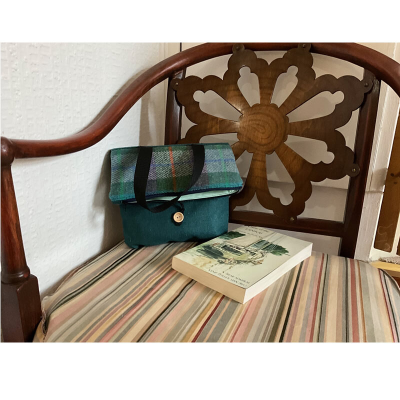 Small genuine Harris Tweed fold-over hand bag. interfaced pastel teal lining with two interior pockets and one outer pocket.