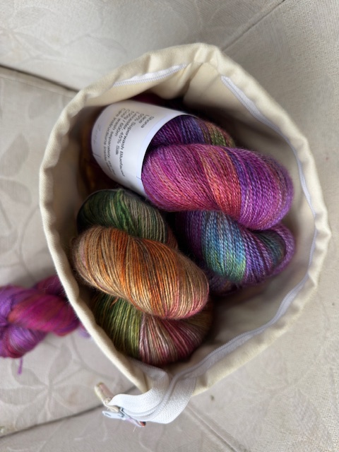 Unique hand-dyed fabric project bags for knitting & crochet. Fully lined, sturdy, and one-of-a-kind. Ideal for small to medium projects. Shop now!