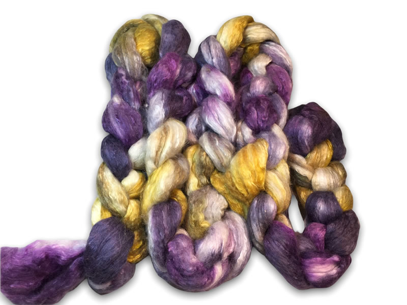 This fibre is made up of 50/50% Polwarth / Mulberry silk combed top. It has a glorious mix of purple and gold with white shades. The fibre has been blended 5 times to produce a smooth and even texture. Polwarth is a matte fibre and so the addition of silk produces a strong and lustrous yarn.